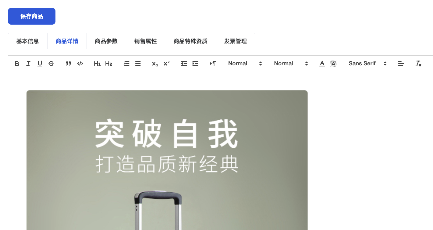 通过图文编辑的方式编辑商品的详细介绍,为了兼容更多的场景和系统,建议使用纯图片的方式。